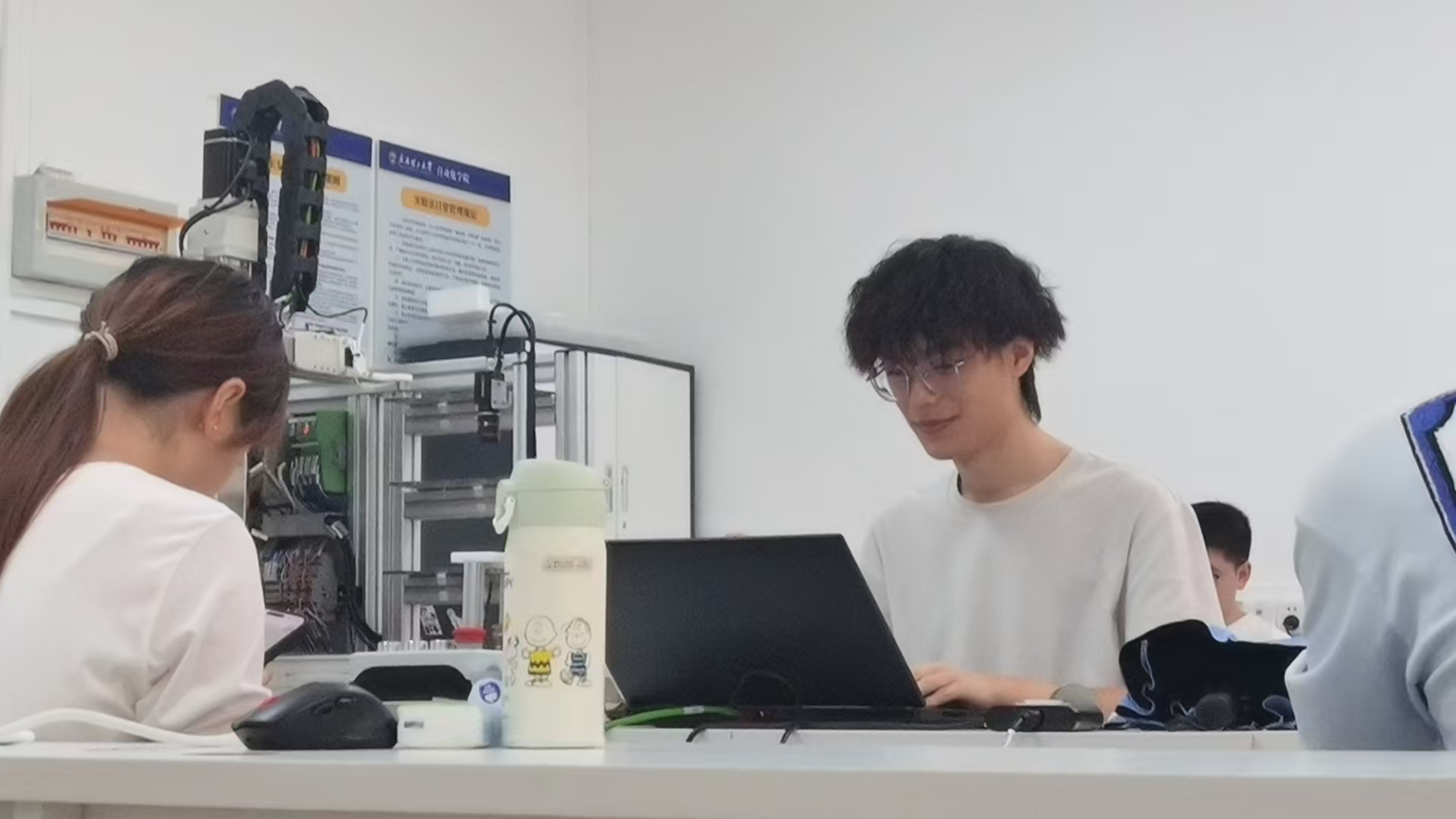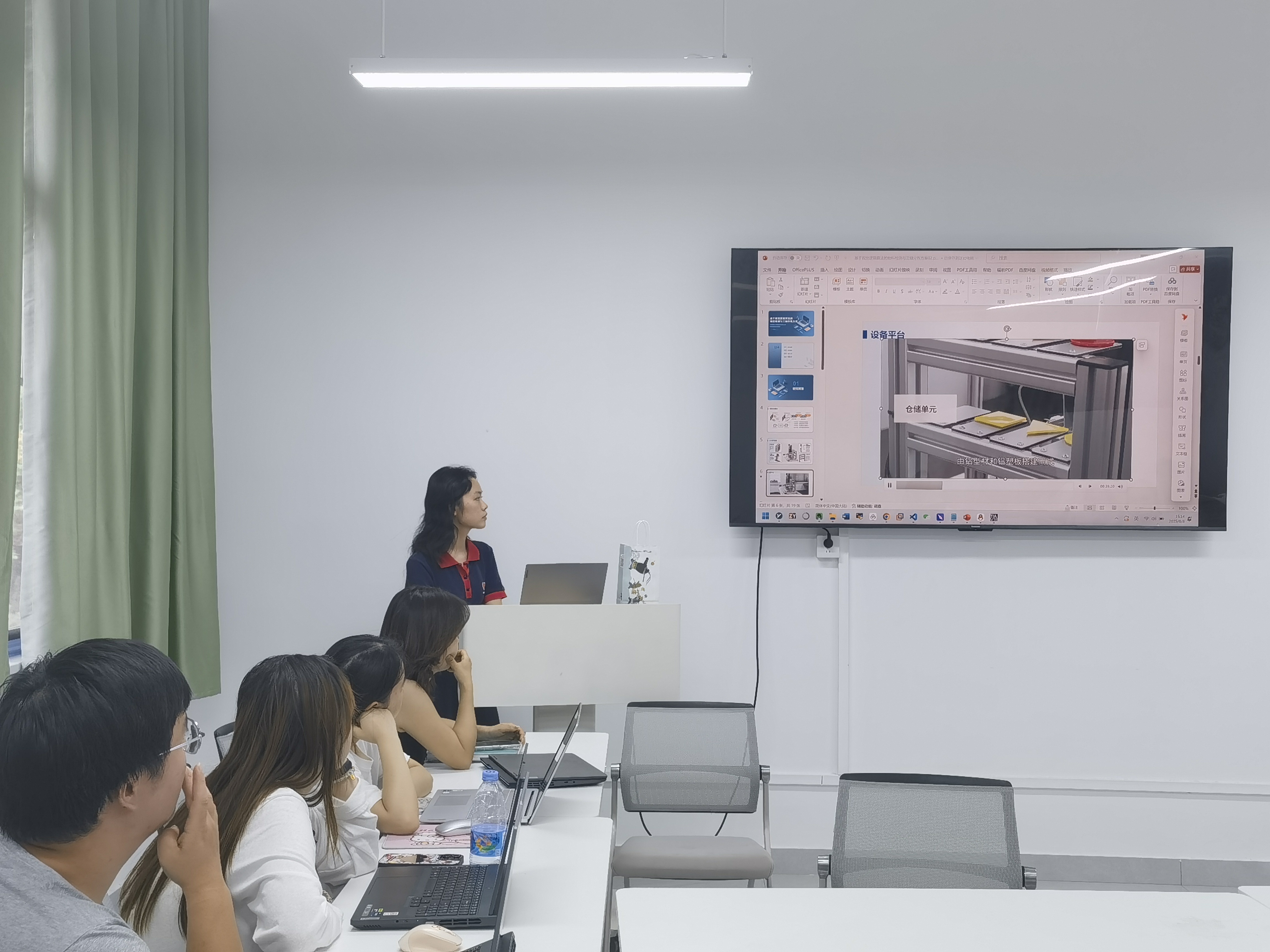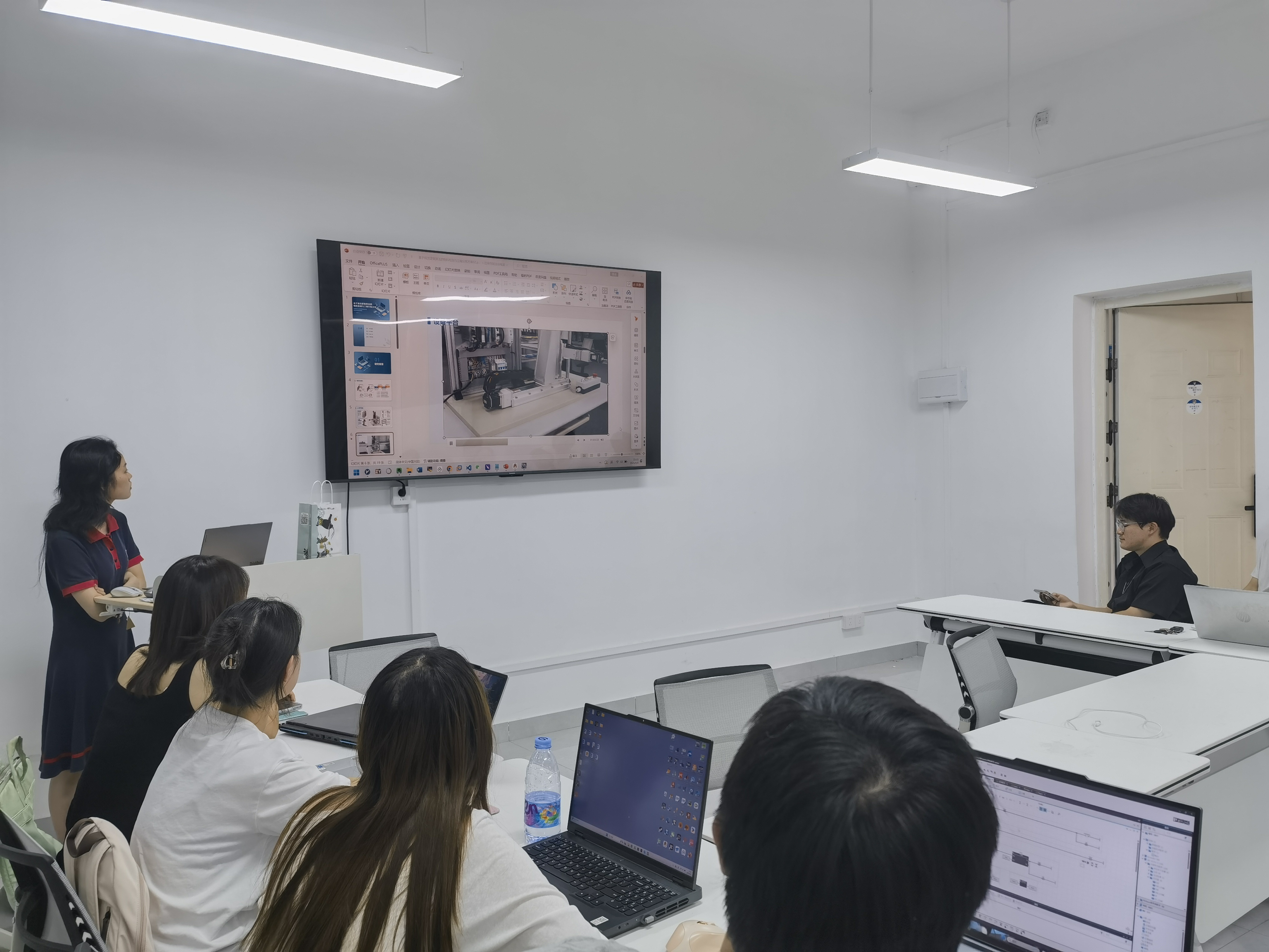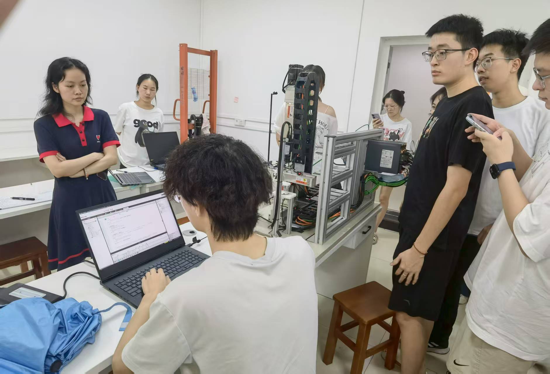 在实操环节中,李傲琦同学依托实验室比赛设备教学,针对精密的机械臂、智能仓储模拟单元等实验装置,为同学们演示了相关实验设备及软件工具的使用方法。从软件环境配置,到编写控制代码、调试参数,一步步带领同学们熟悉操作。同学们围在设备旁,学习具体操作,积极讨论,交流算法问题和视觉检测模块搭建思路。