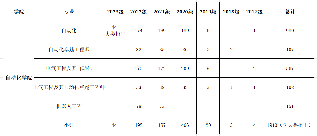 自动化学院本科生分年级分专业分布情况