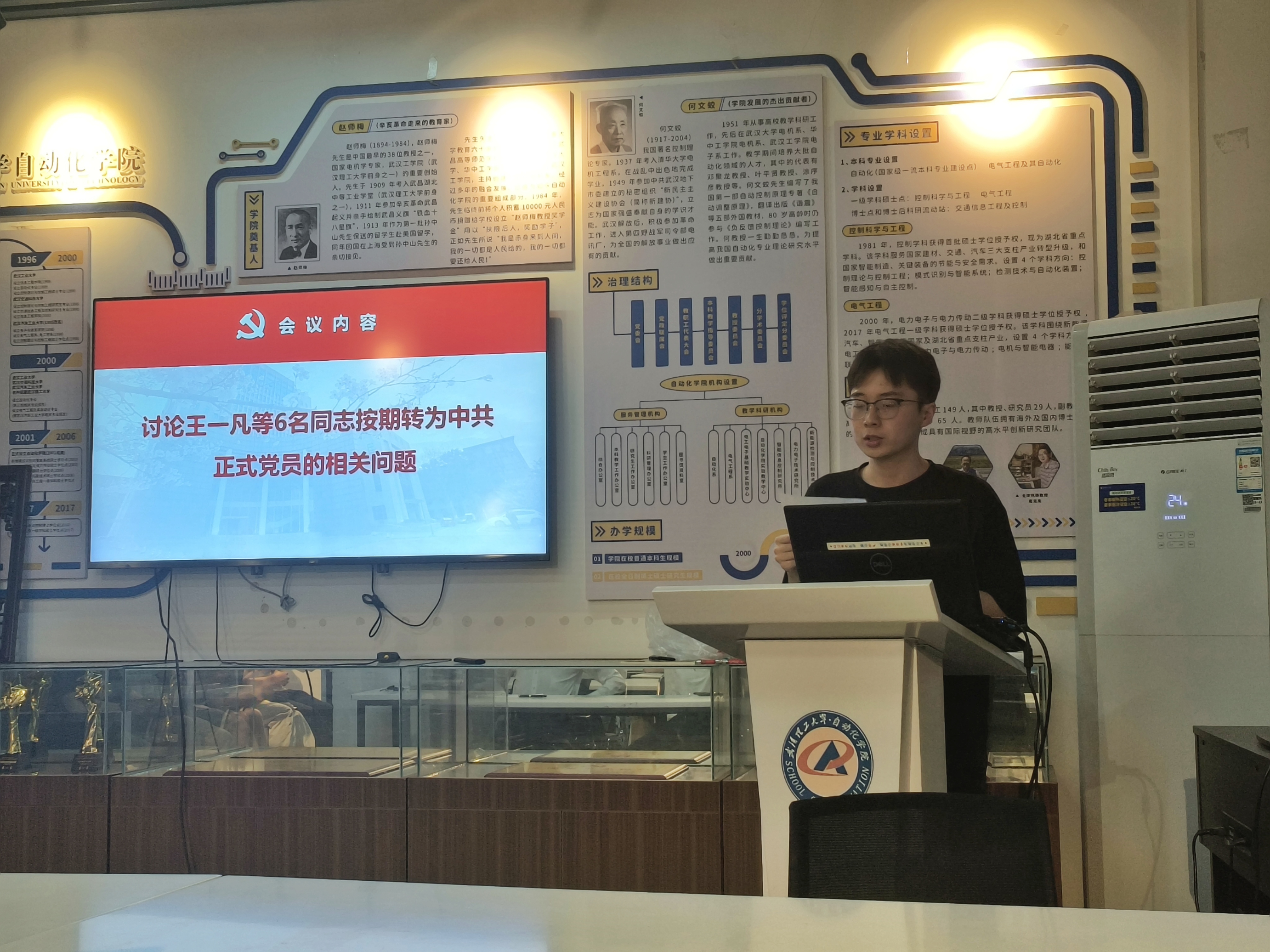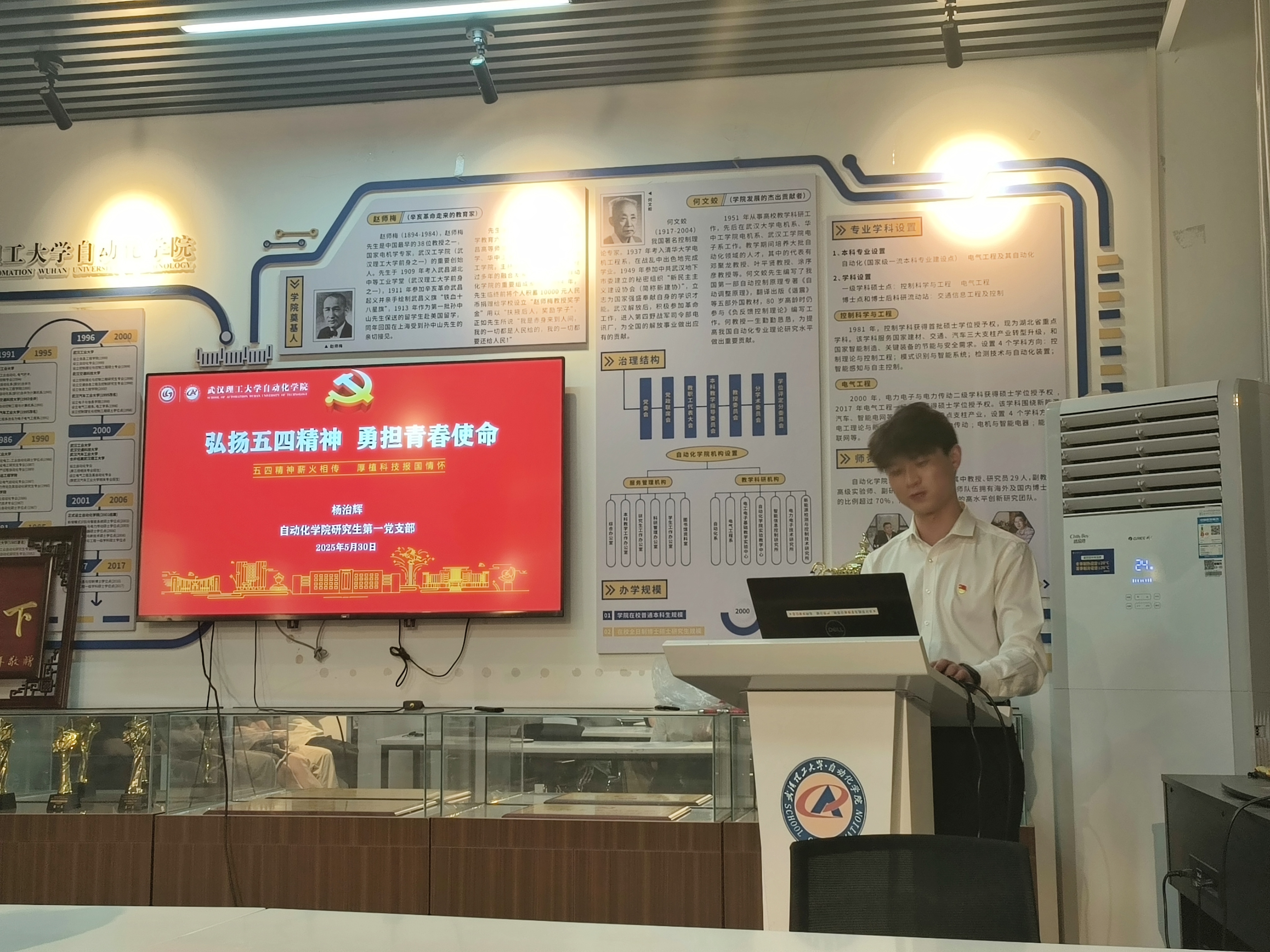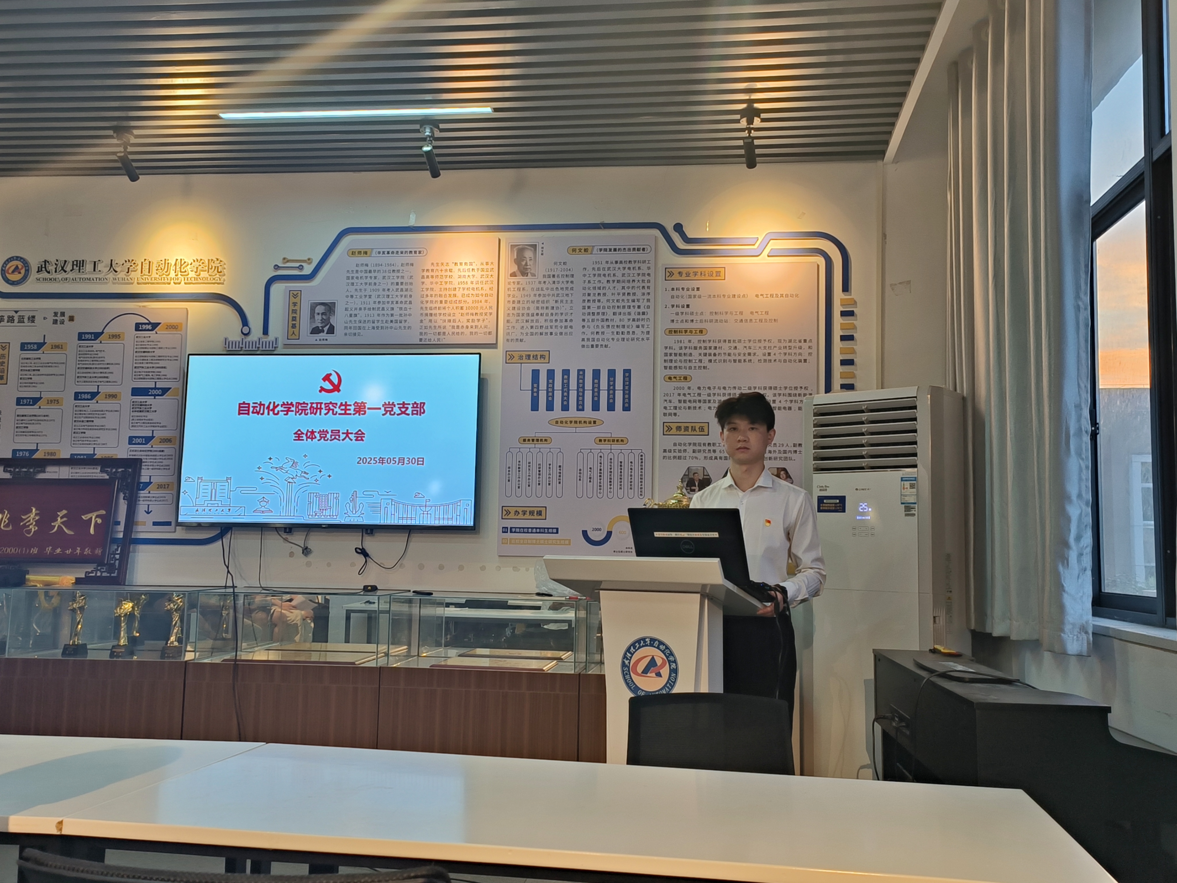 5月30日晚,研究生第一党支部于自动化学院综合楼文化展厅召开全体党员大会暨弘扬五四精神的党课学习活动。本次会议由党支部书记杨治辉同志主持,全体党员参加。