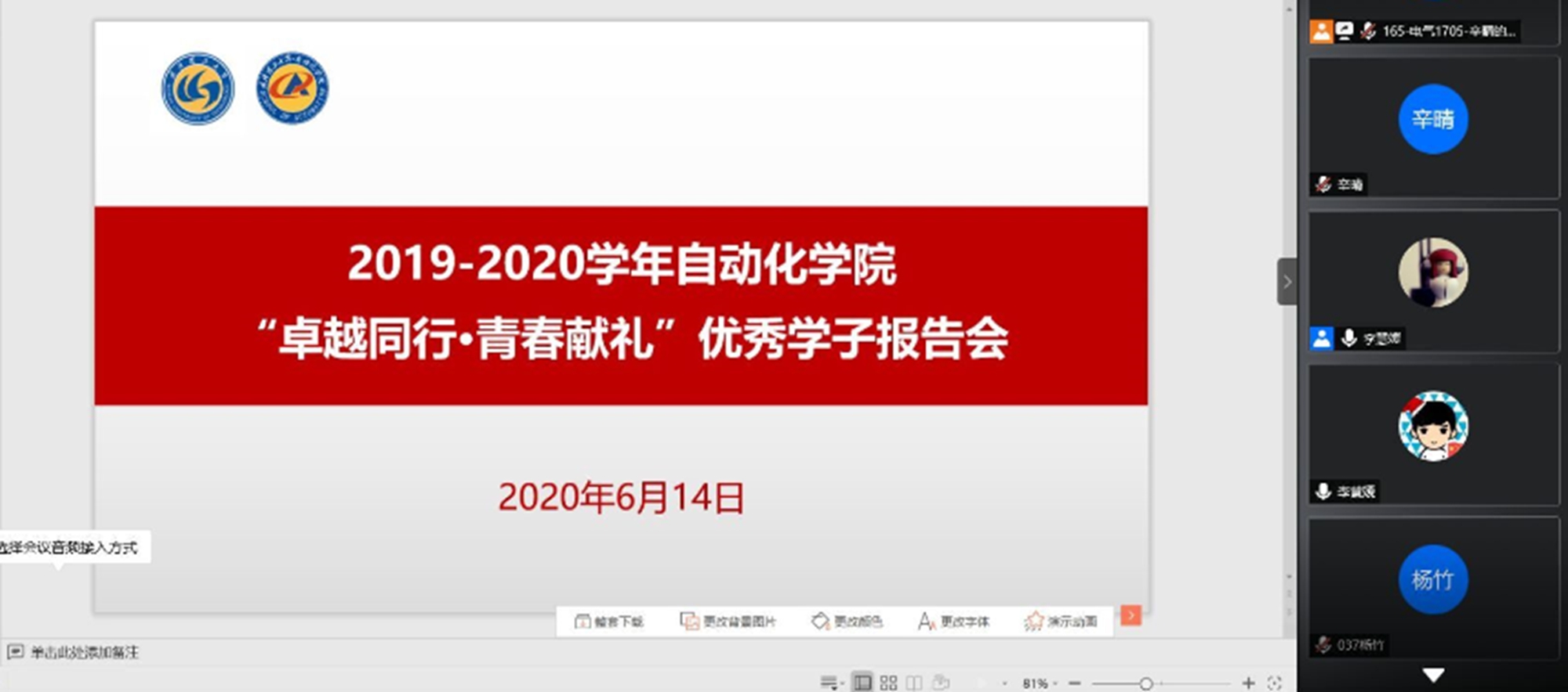 6月14日下午,自动化学院团委学生会面向2017级学生举办了“卓越同行·青春献礼”优秀学子报告会第三讲——就业经验分享专场。优秀学生代表付樊、优秀校友代表张硕分别结合自身经历,对2017级同学进行了经验分享。