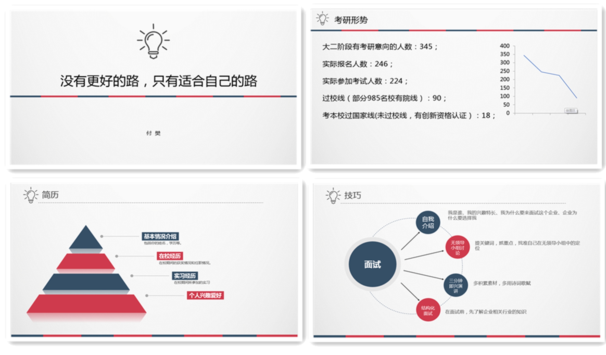 2016级学生付樊以“没有更好的路,只有适合自己的路”为主题进行分享,他从“本科生求职没竞争力”这一误区着手,结合2016级考研的相关数据,指出同学们应根据个人实际情况,做好自我生涯规划,在就业和读研的选择上不盲从。随后,他结合自己求职经历,给同学们提出了明确目标、调整心态等建议,介绍了求职过程中准备环节、简历书写、目标调整、应聘技巧所要注意的要点和细节。