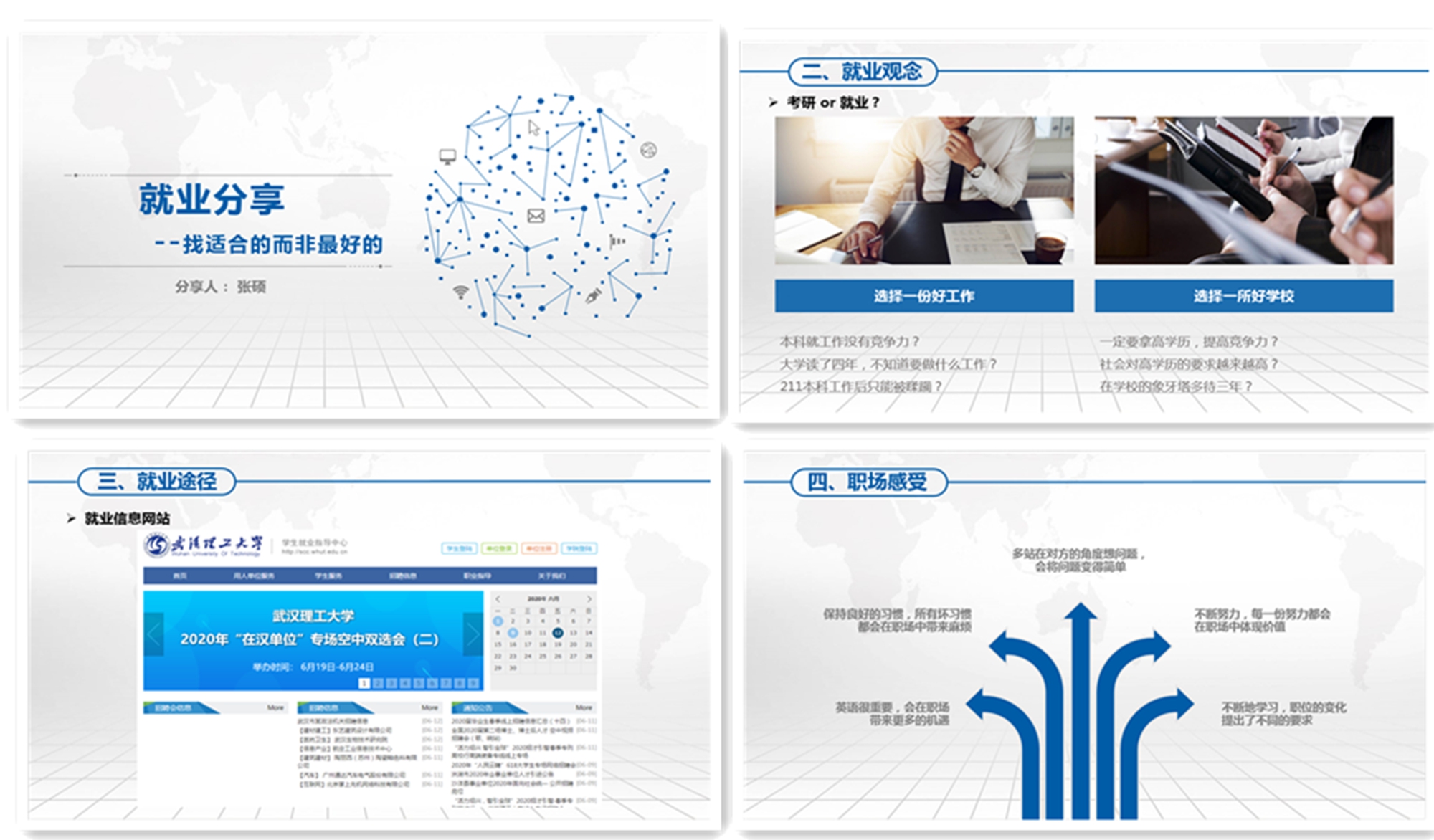 2015级校友张硕以“找适合的而非最好的”为主题,从就业观念、就业途径和职场感受三分方面分享经验。他结合自己择业的心路历程,建议大家在做职业规划和就业选择的时候要综合考虑自身情况和价值观。此外,他分享了自己一年工作的实际感受,为大家提出了重视英语学习、摒弃不良习惯、学会换位思考、保持终身学习等建议。