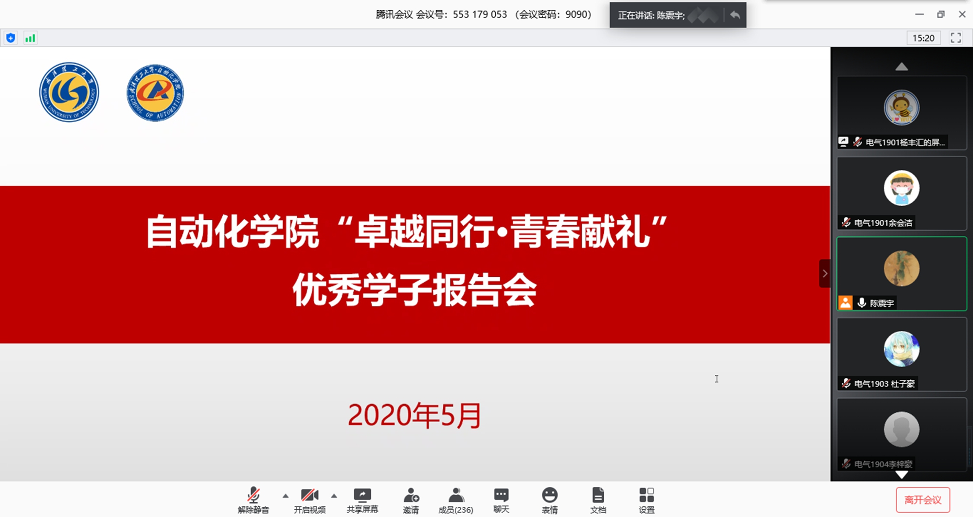 为深化学生思想教育价值引领,充分发挥榜样作用,促进学院优秀学生交流,激励广大学生争做有理想、有追求、有担当、有作为、有品质、有修养的时代新人,自动化学院团委启动2020年“卓越同行·青春献礼”系列优秀学子报告会。5月24日晚,首场优秀学子报告会面向2019级本科生开讲,全体本科新生参与活动。