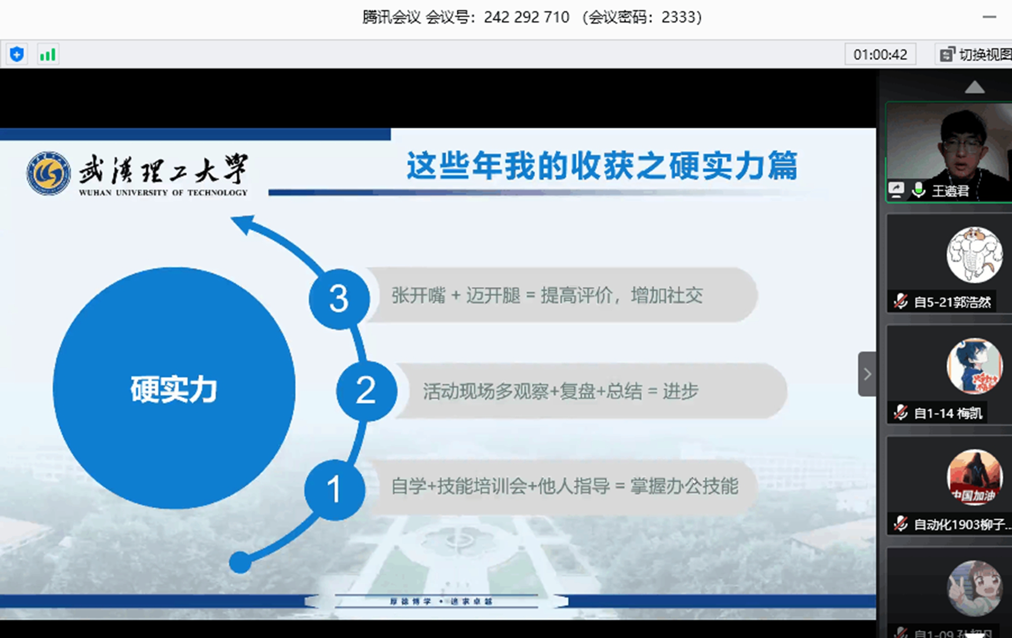 本次报告会邀请2016级优秀学生代表王皓冉、付樊, 2017级优秀学生代表李健、王遵君,分别从科技创新、就业求职、学业提升、学生工作四个方面进行分享。