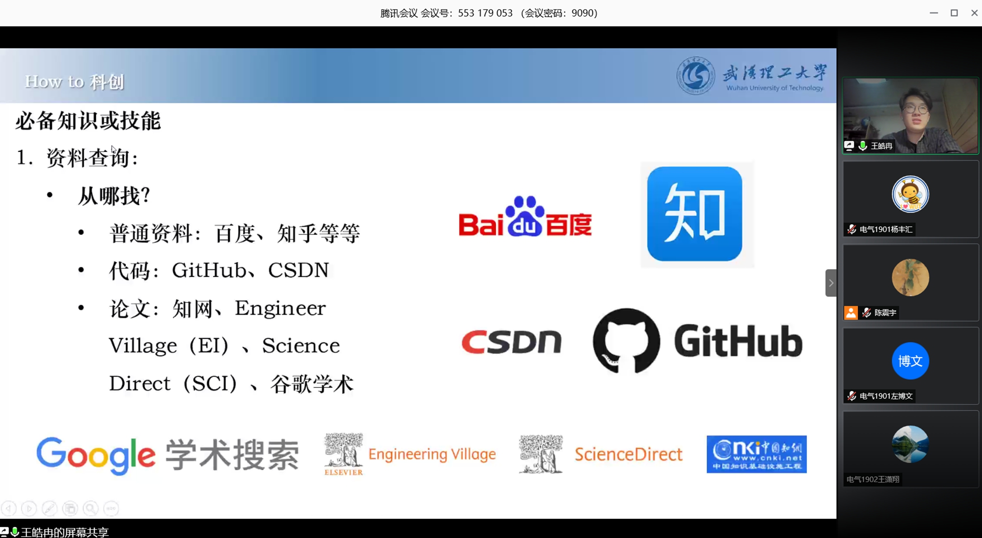科研达人王皓冉同学从“科技创新是什么”“科技创新的动机”“做科技创新的时间”“做科技创新必备的知识或技能”四个方面分条阐述学生参加科技创新活动和赛事需要关注的要点。他指出,为平衡课程学习、科研与日常生活,自身应做好时间管理,从而平衡各项事务,并强调时间规划的重要性。他表示科技创新要趁早,但现在开始也绝不算晚,以此鼓励广大2019级同学踊跃参加各类科技创新活动,不断提升专业学习能力和素养。