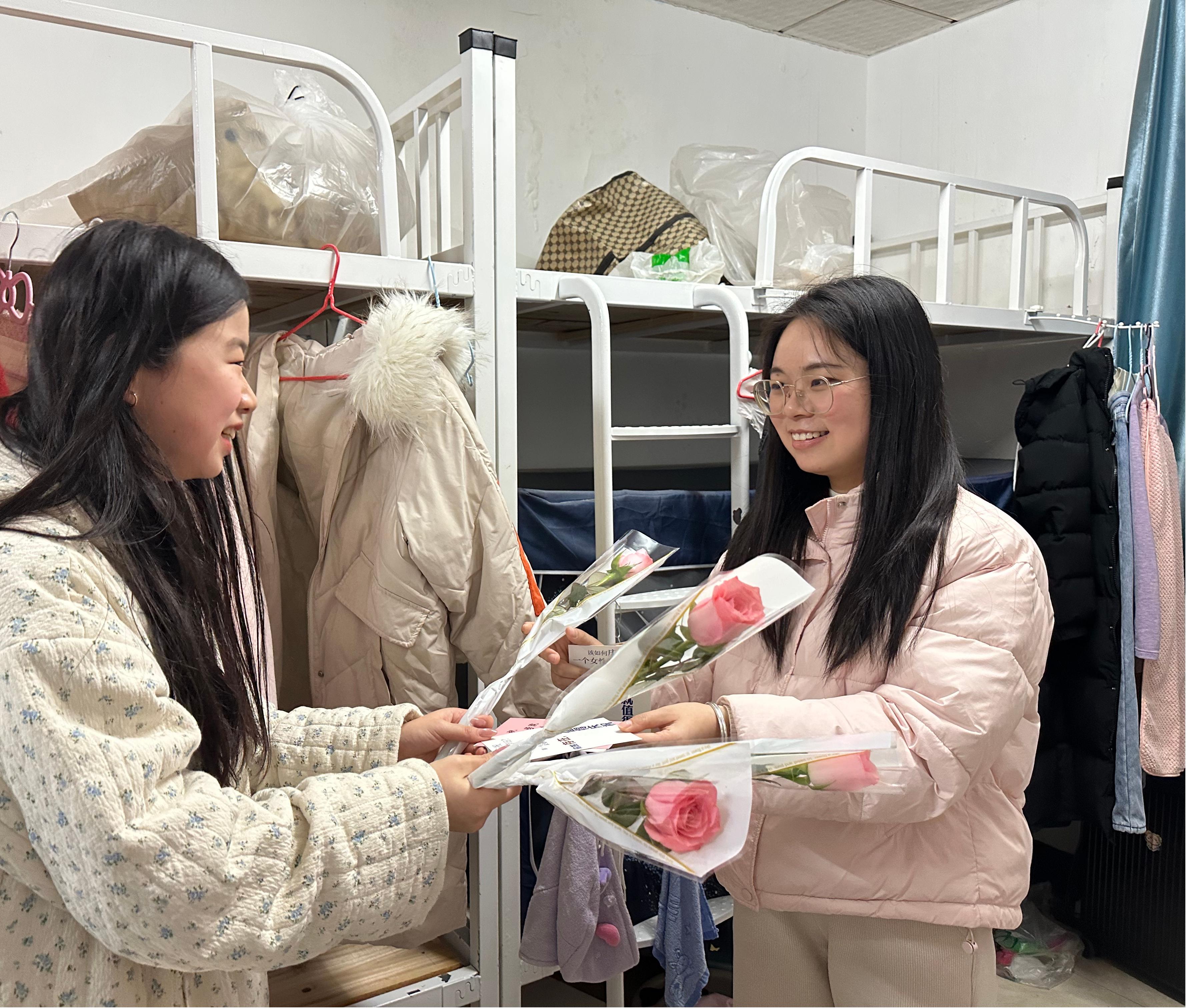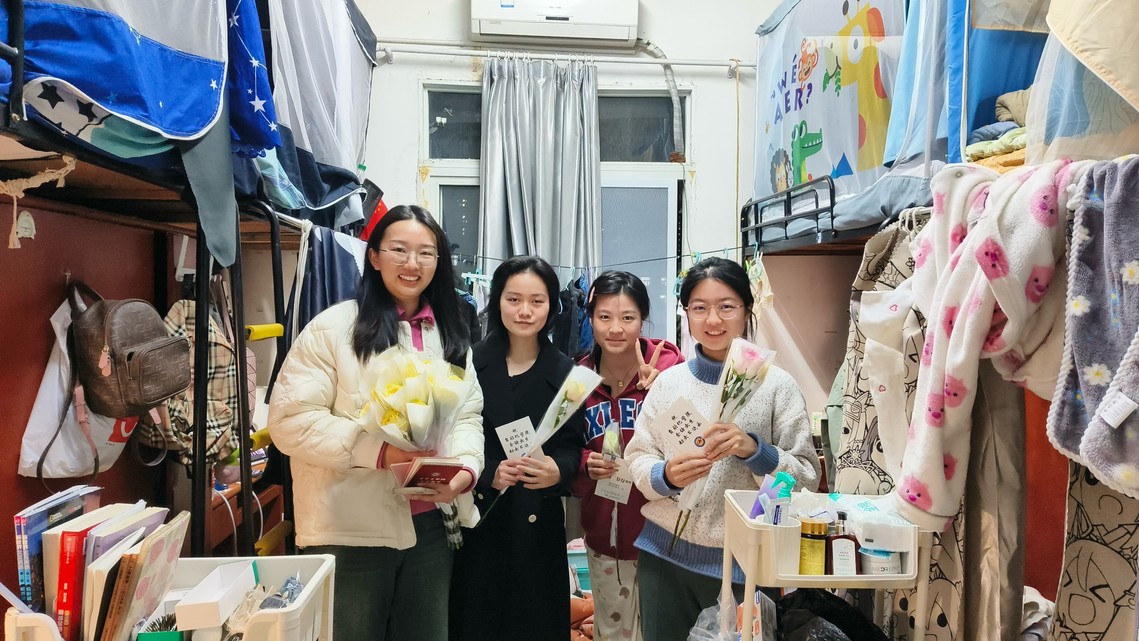 在北一舍,由24级年级委牵头,为大一的女生们驱散疲惫、点亮心情;东四舍里,辅导员周芷馨老师带领办公室干事以及 23 级年级委,为大二女生送上诚挚的祝福;与此同时,东九舍那边,石晓琪老师带领学习部干事,将鲜花与贺卡化作对大三、大四女生们的美好期许;而在研究生宿舍,彭文语老师和杜婕老师怀揣着温暖轻轻敲开一扇扇门,将这份感动传递到每一位研究生女生手中。