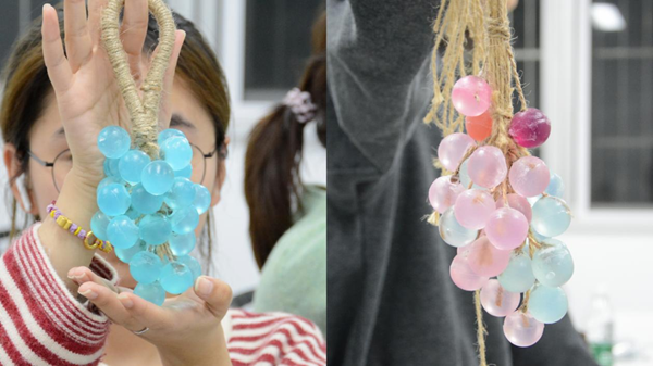 讲解示范结束后,同学们迅速投入创作。大家根据自己的喜好,分别加入不同颜色的食用级色素和各具特色的精油——有的同学选择清新的薰衣草精油搭配淡紫色,有的同学选用甜美的柑橘精油调配浅粉色,还有的同学尝试混合色素打造渐变效果,现场香气四溢。当一个个晶莹剔透、带着专属香味的葡萄手工皂从模具中完整取出时,课堂里响起阵阵赞叹。同学们拿着自己的作品相互展示,分享调色技巧与精油搭配心得,脸上满是创作的自豪与喜悦,深刻体会到“慢工出细活”的匠心真谛。