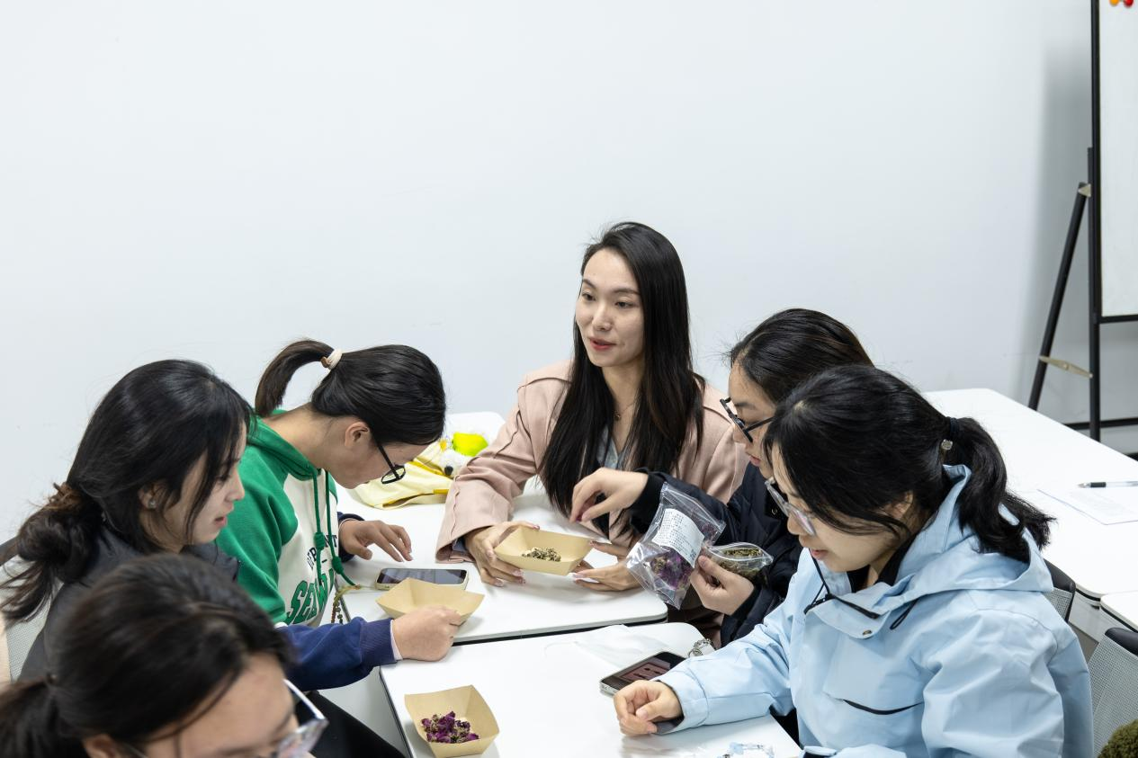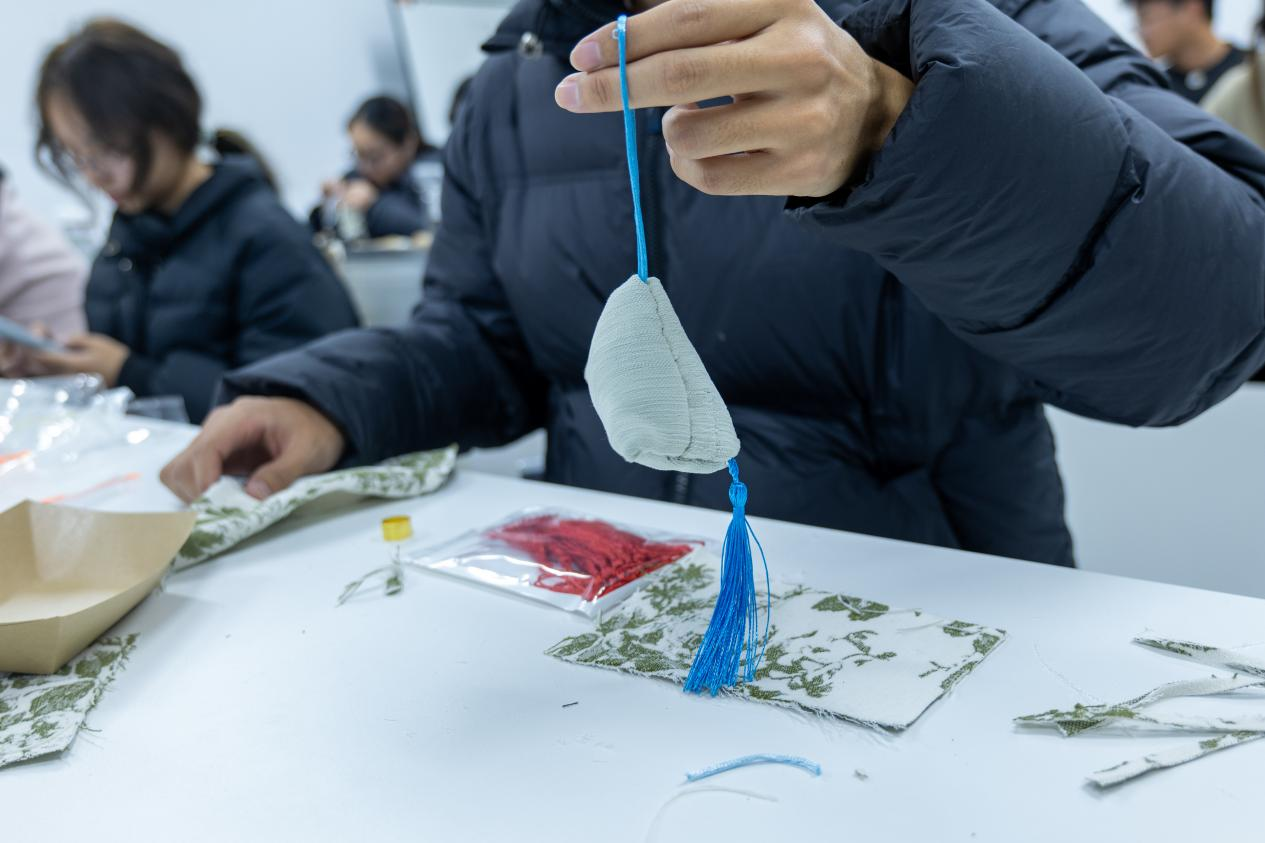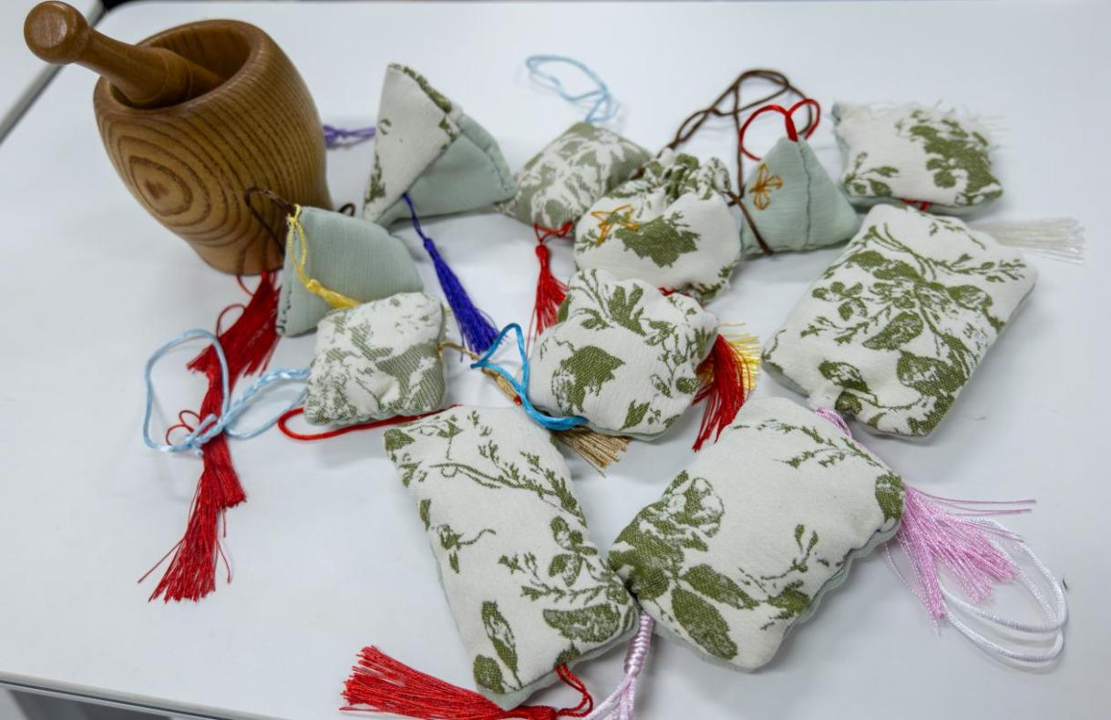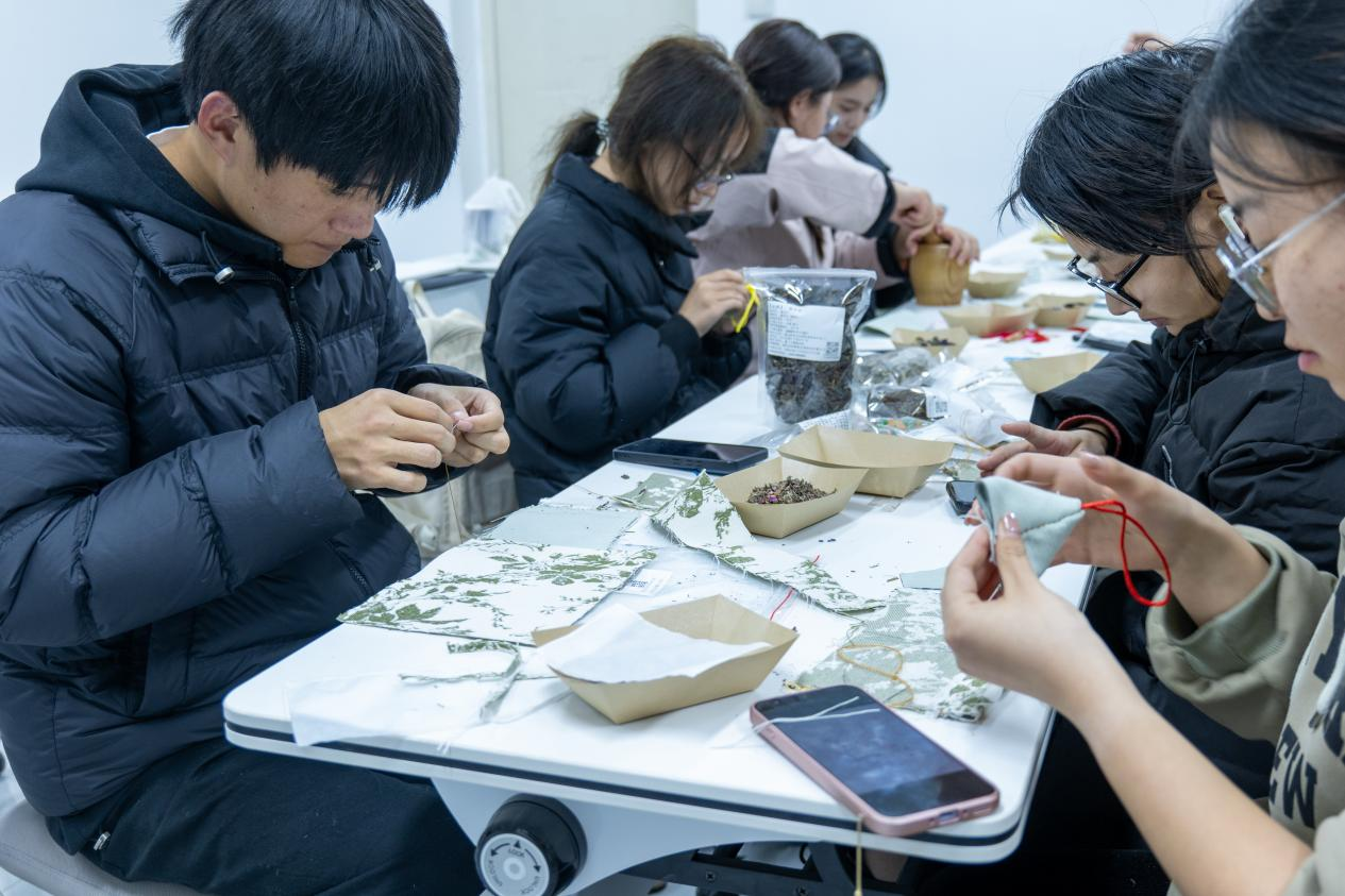讲解示范结束后,师生们迅速投入到香囊制作中。大家精心挑选心仪的锦缎布料,根据喜好搭配中药材组合——有的同学偏爱清新提神的薄荷与艾草搭配,有的同学选择温润安神的陈皮与丁香组合,还有的同学尝试多元搭配打造专属香气。裁剪布料时凝神专注,填充药材时细致把控用量,缝制边缘时一针一线精益求精,现场弥漫着浓郁的本草馨香与创作热情。当一个个绣工精巧、香气醇厚的中药香囊制作完成,同学们纷纷展示自己的作品,分享药材搭配的思路与缝制技巧,脸上洋溢着满满的成就感,真切体会到“专注执着、精益求精”的匠心真谛。