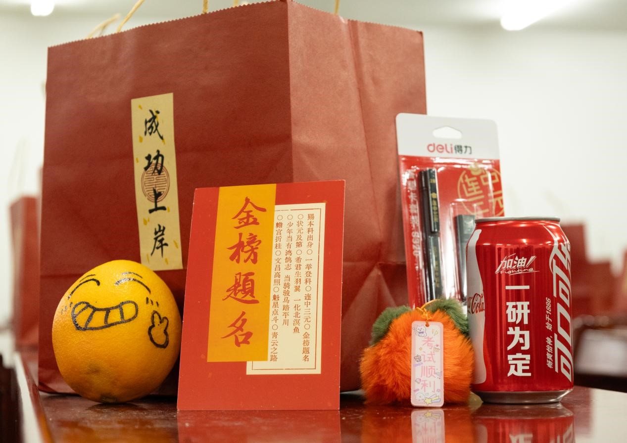 紧接着,辅导员石晓琪老师现场解读礼包寓意:印着“成功上岸”的精致礼袋,承载着师生共同的美好祝愿;手绘金榜题名明信片,字里行间满是温情叮嘱;暖宝宝驱散冬日严寒,为备考与应考增添暖意;笑脸橙子搭配毛绒柿子,藏着“心想事成、事事如意”的美好期许;印着“一研为定”的定制可口可乐,愿学子们逐梦路上顺心顺意;脆升升薯条寓意“步步高升、成功升学”;考场文具则为学子们保驾护航,助力笔尖生花。一件件饱含心意的礼物,将学院的关怀精准传递到每一位学生心中。