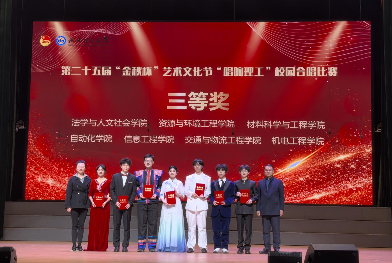 11月20日晚,武汉理工大学第二十五届“金秋杯” 艺术文化节 “唱响理工” 校园合唱比赛决赛在西院大礼堂圆满落幕。我院青禾合唱团凭借一曲饱含家国情怀的《龙的传人》惊艳亮相,以扎实的演唱功底与真挚的情感表达斩获三等奖。