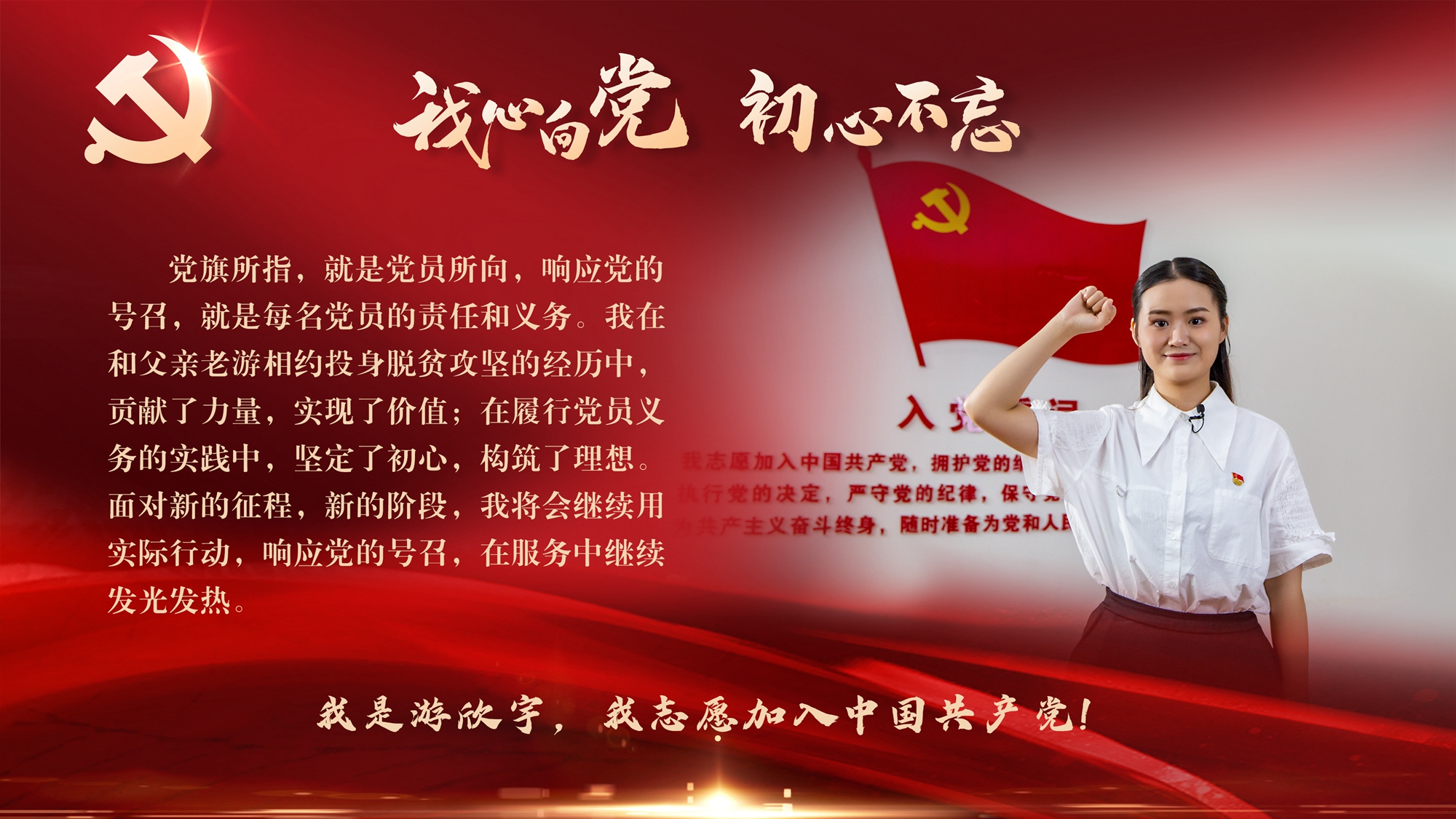 【我心向党·初心不忘】党旗所指,就是党员所向,响应党的号召,就是每名党员的责任和义务。我在父亲老游相约投身脱贫攻坚的经历中,贡献了力量,实现了价值;在履行党员义务的实践中,坚定了初心,构筑了理想。面对新的征程,新的阶段,我将会继续用实际行动,响应党的号召,在服务中继续发光发热。我是游欣宇,我志愿加入中国共产党!