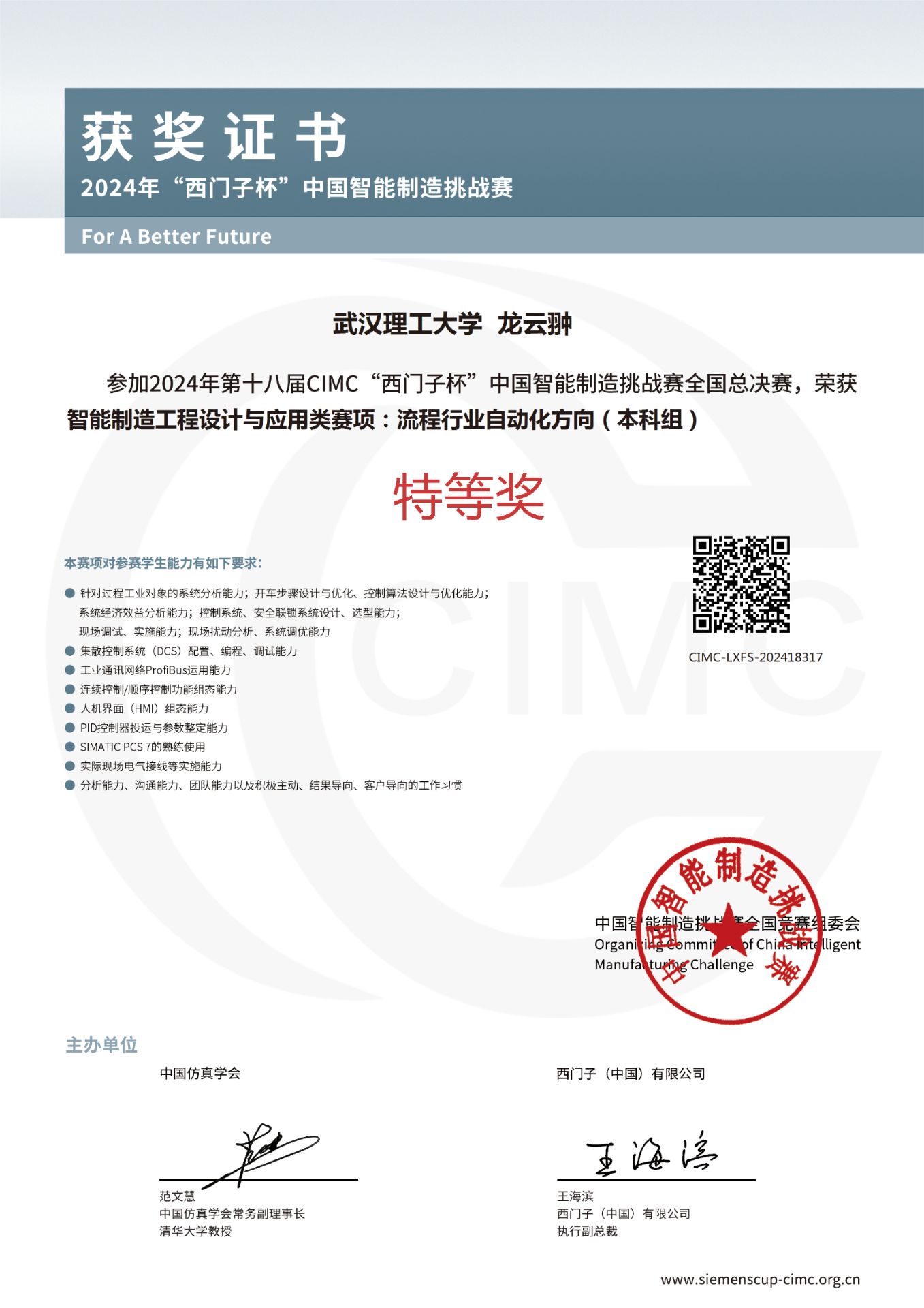 此外,在第十八届“西门子杯”中国智能制造挑战赛中,龙云翀作为队长,带领团队针对工业锅炉系统,基于SMPT-1000过程控制实验平台设计了一套完整的控制回路和顺序控制程序,实现了系统从冷态开车到平稳投运的完整流程,同样获得全国特等奖。